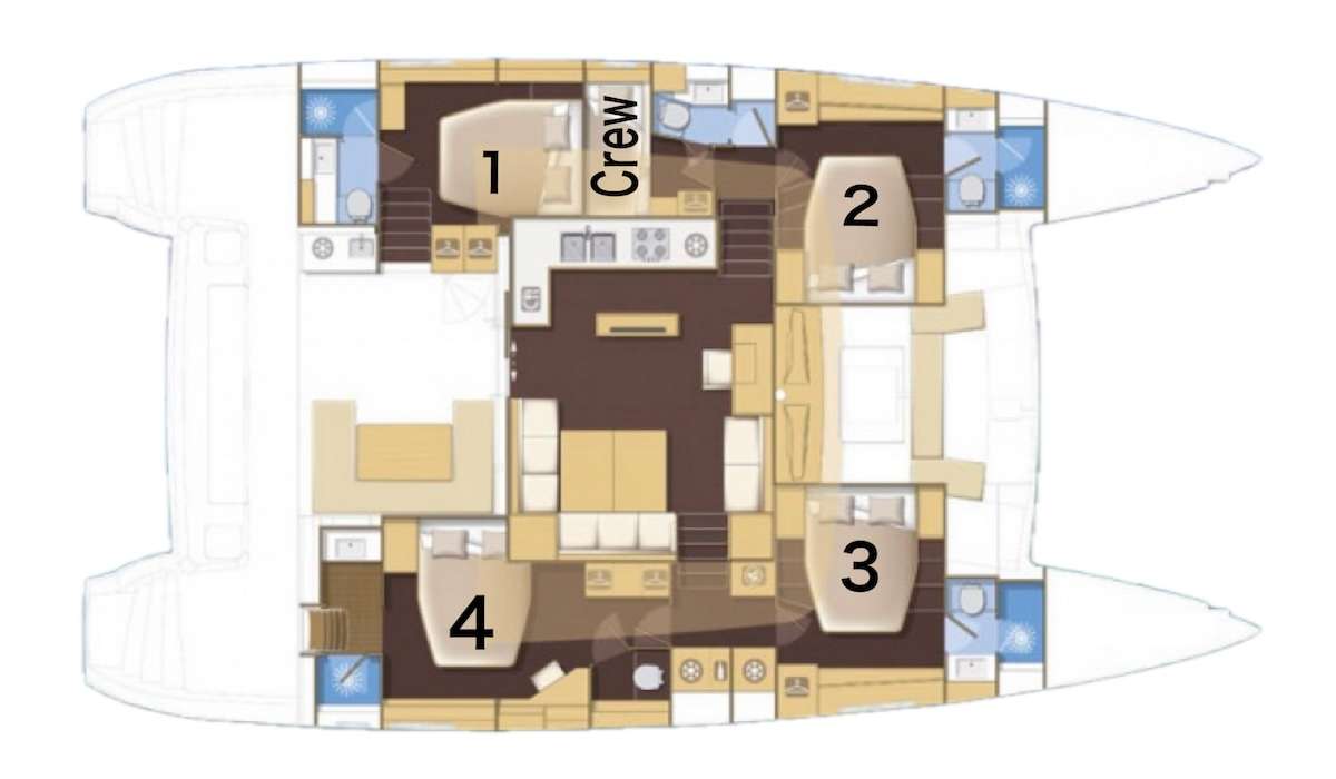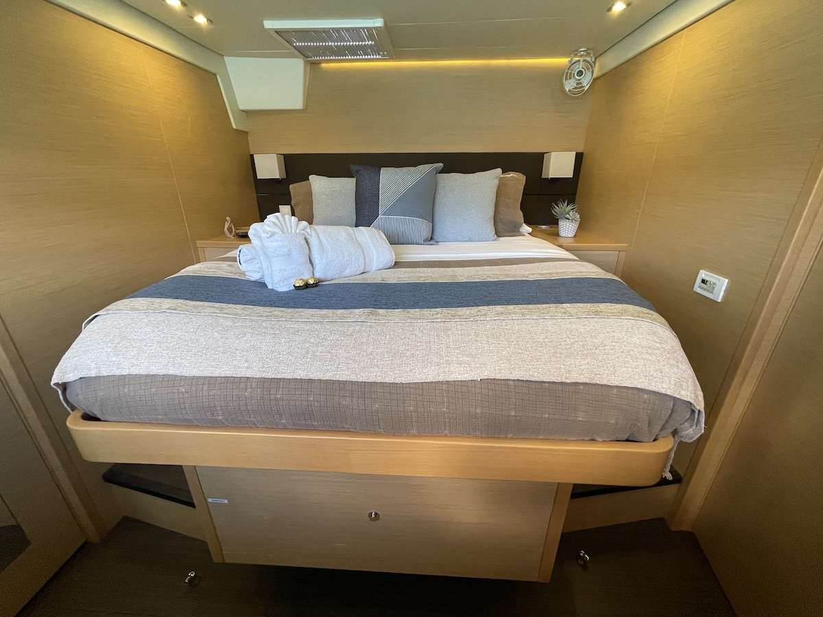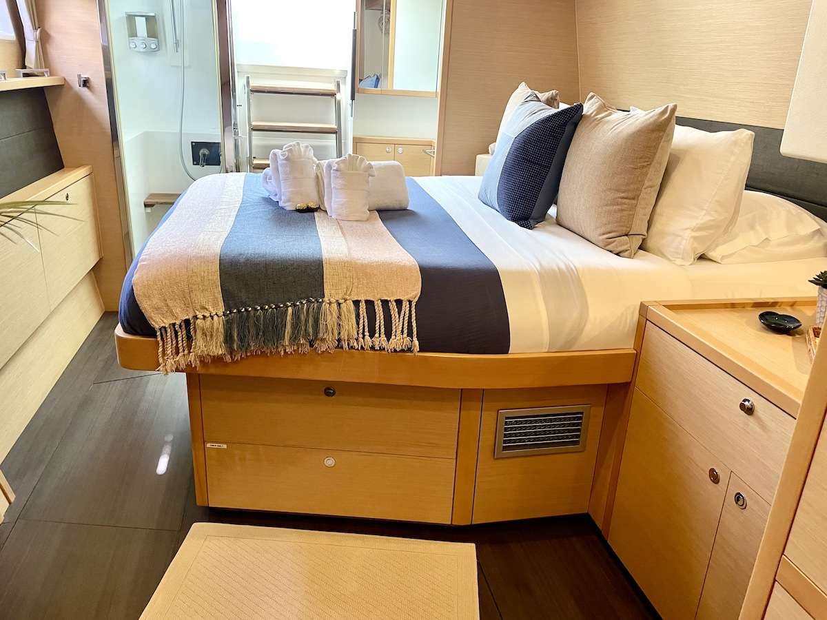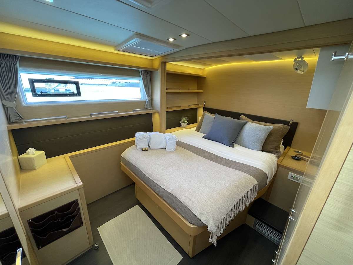 1 Master cabin with queen bed and 3 spacious guest cabins with queen-sized beds.