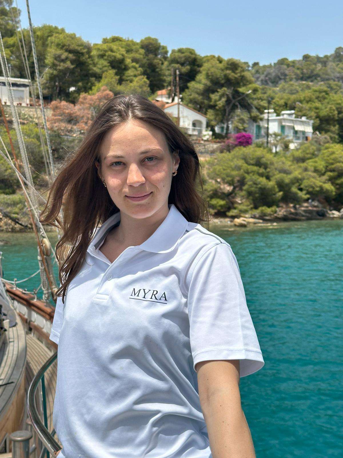 Meet Valentina, the Chief Stewardess aboard Myra. With a degree in Business Economics, Foreign Trade, and Financial Marketing, coupled with a diploma in tourism, she brings a wealth of knowledge and expertise to her role. Valentina’s background as a former maître in Italian restaurants underscores her impeccable service and hospitality skills. As a second-level sommelier, she elevates onboard dining experiences with her deep understanding of wine. Fluent in Italian, English, Spanish, and French, Valentina effortlessly bridges communication gaps to ensure seamless guest and crew interactions. Resourceful, organized, and creative, she is driven by her passion for delivering exceptional results and creating unforgettable moments for her guests. Valentina’s open-mindedness and tenacity make her an invaluable asset, consistently exceeding expectations and enriching the onboard experience on Myra.