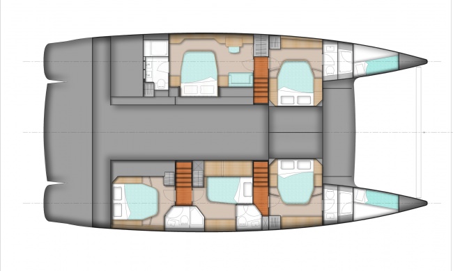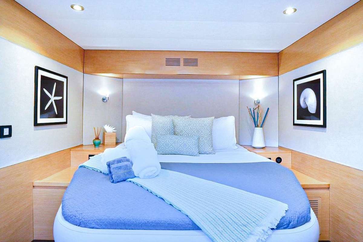3 large queen cabins and an enlarged Primary cabin, all with walk around queen size beds, all fully en suite. FULL A/C throughout the yacht.