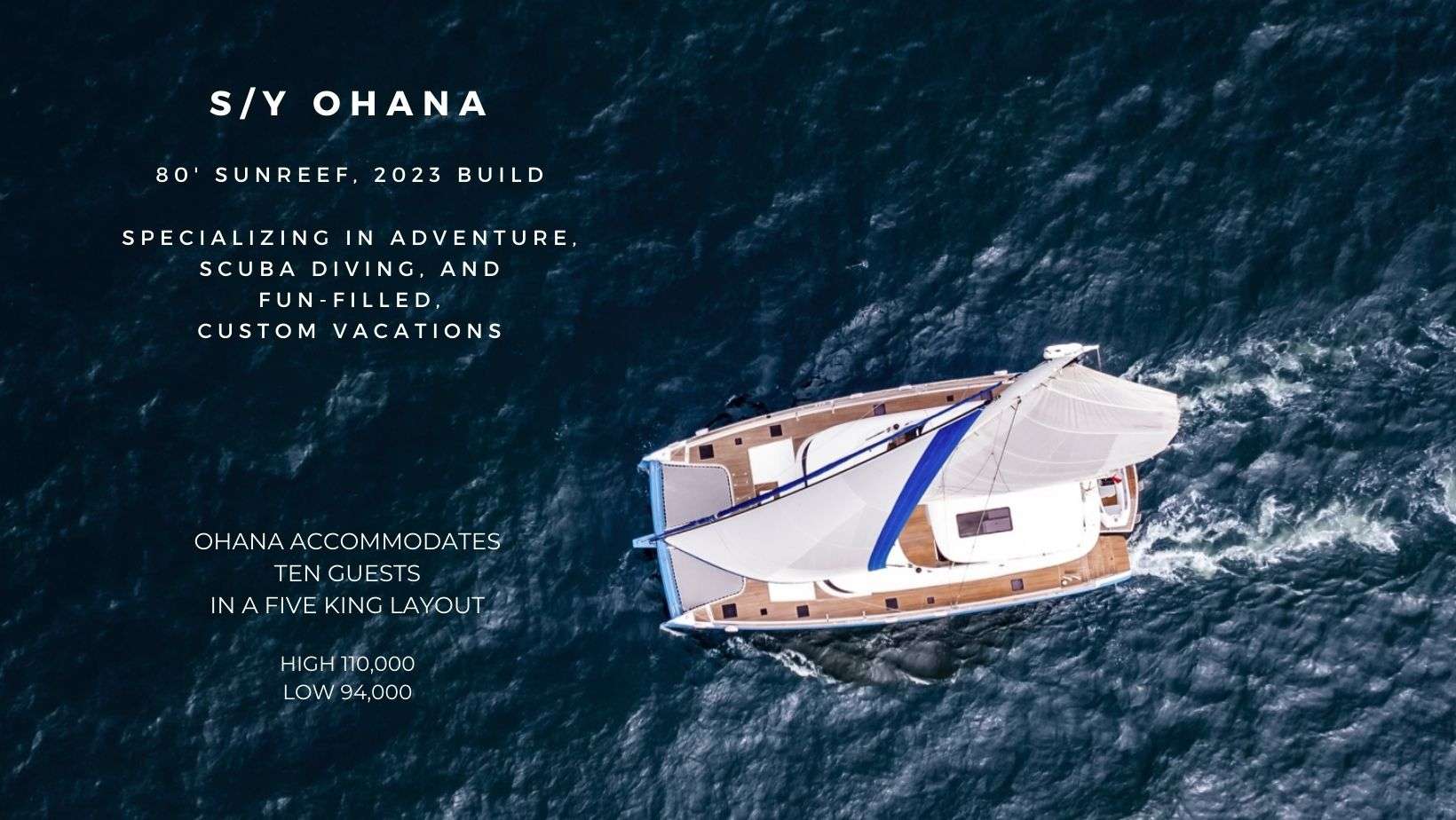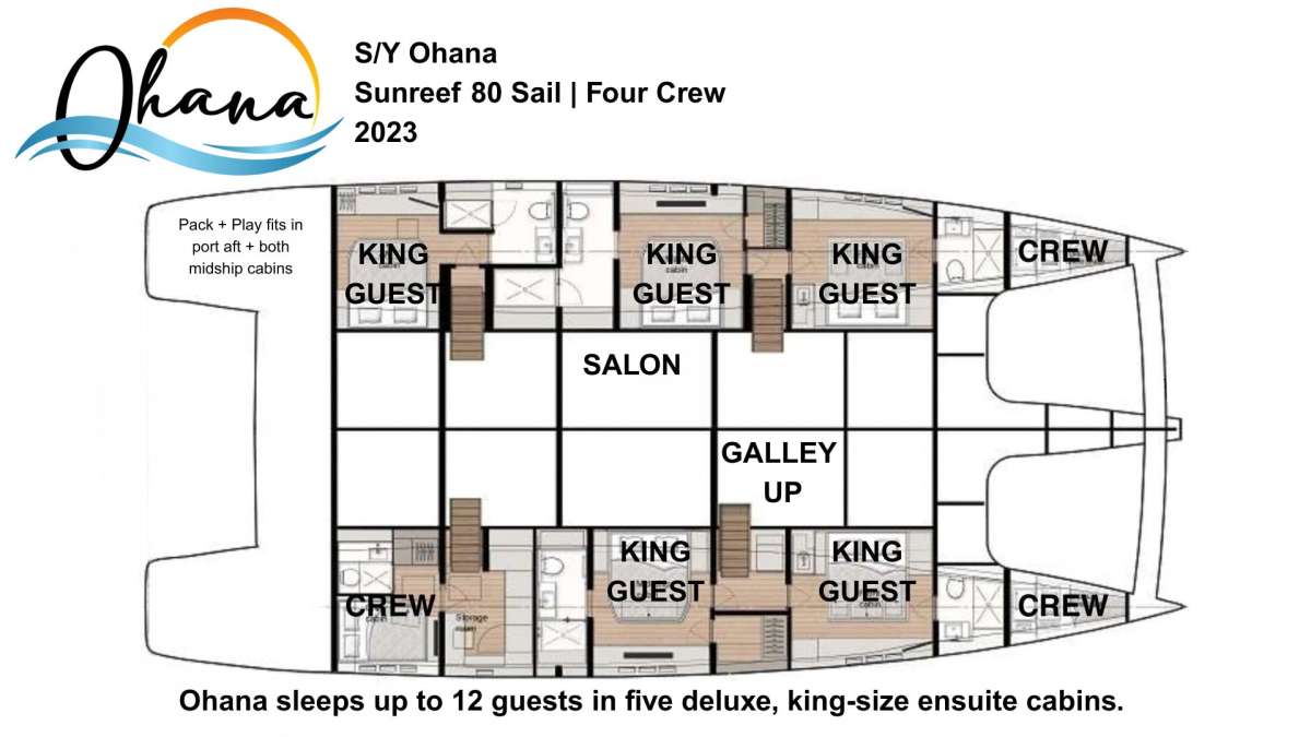 Ohana sleeps up to ten guests in five deluxe, king-size ensuite cabins. The king beds are all floor-level berths with full-walk around access. Each cabin boasts a mirror-covered wall to allow for maximum light during the day and lend an airy vibe to the comfortable cabins.