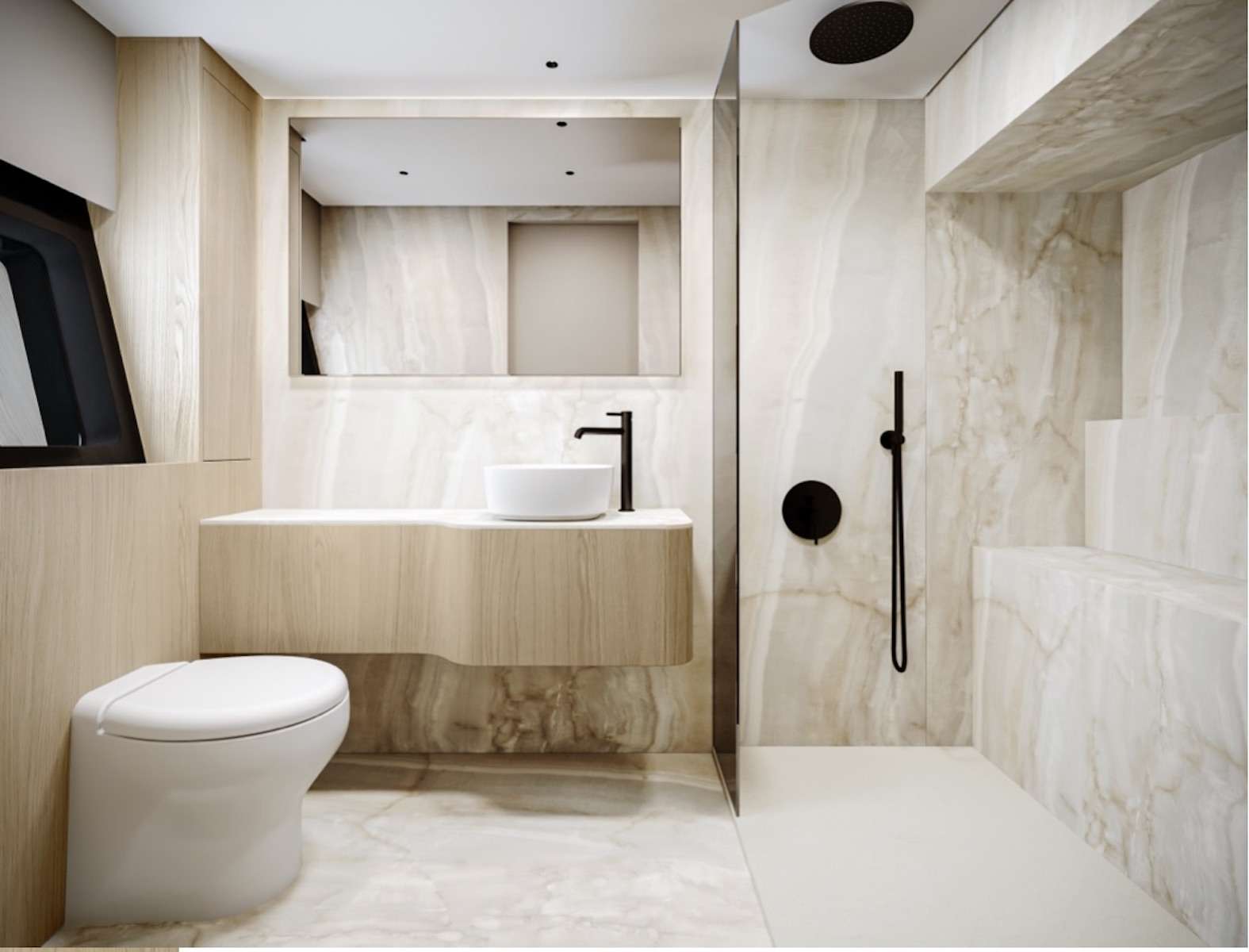 The generously sized saloon, featuring a sofa and dining table, creates a welcoming and elegant atmosphere. With direct access to both the front and aft decks, passengers can seamlessly enjoy the breathtaking views of the surrounding ocean. The large flybridge further enhances the vessel’s appeal, providing additional seating, a bar, and a dining area, allowing guests to relax and unwind in style.